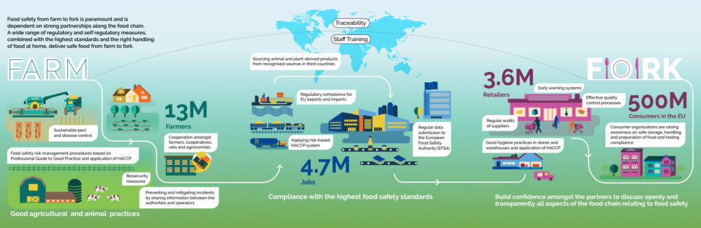 Los alimentos de hoy en la UE son más seguros, de mayor calidad y tienen una vida útil más larga que nunca. La seguridad de los alimentos se ve afectada por la salud de los animales, las plantas y el entorno en el que se producen. La adopción de un enfoque holístico de la inocuidad de los alimentos generará un mejor sistema de inocuidad de los alimentos. Los miembros de la Plataforma de Seguridad Alimentaria (CELCAA, Copa-Cogeca, EuroCommerce, FEFAC y FoodDrinkEurope) también han desarrollado un folleto infográfico que muestra su responsabilidad conjunta en la entrega de alimentos seguros de la granja a la mesa, que se puede descargar aquí.