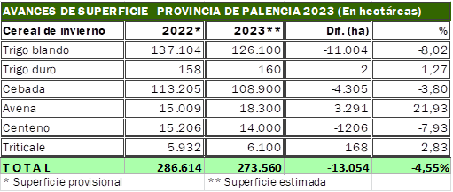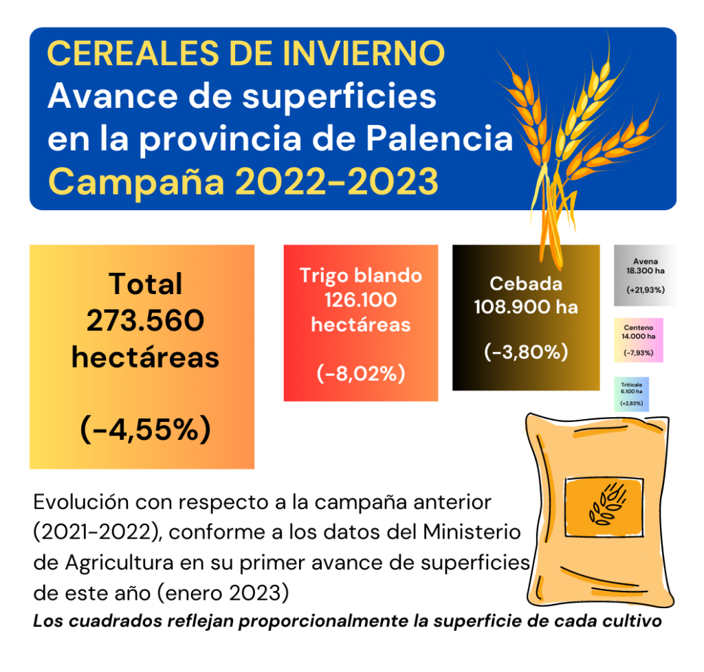 Los agricultores de la provincia de Palencia han apostado esta campaña menos por los cereales de invierno, que ocuparán el 4,55 % de superficie que en la anterior. En algunos casos, como en el trigo, se registra un descenso aproximadamente del 8% con respecto a las superficies cultivadas en 2021 y 2022.  Un descenso similar se registra en las tierras sembradas de centeno, si bien la provincia de Palencia se mantiene como líder de España en este cereal. La bajada en superficie es menor en la cebada (-3,8%), pero se suma a una tendencia que prácticamente ha reducido a la mitad el terreno para este cultivo: de más de 200.000 hectáreas en 2008 se ha pasado a menos de 109.000 en la actual campaña. ASAJA-Palencia lamenta que detrás de este descenso en los cultivos de cereal de invierno, que se observa en el conjunto del país, se halle una elevada inflación que repercute en los costes de producción. Asimismo, destaca la incoherencia para la estrategia nacional que implica mermar cultivos básicos para la alimentación en un contexto internacional de tanta incertidumbre.