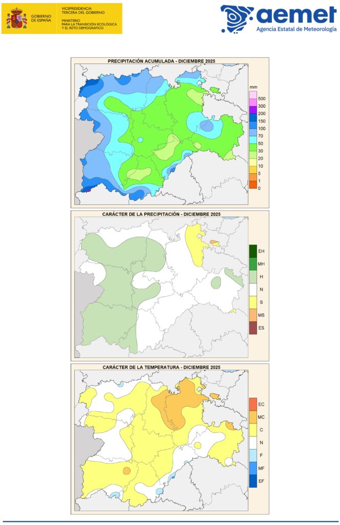 Según la AEMET en Castilla y León, las temperaturas máximas fueron relativamente normales durante diciembre, pero la anomalía positiva en las temperaturas medias fue de siete décimas, y en las mínimas llegó a grado y medio con respecto a lo que cabe esperar ese mes./