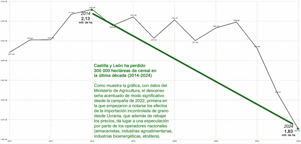 La superficie de cereal en Castilla y León alcanzó en la campaña de 2014 los 2,13 millones de hectáreas. El pasado año no se llegó a las 1,83 millones, lo que representa una pérdida de unas trescientas mil hectáreas en una década y un descenso que supera el 14 % desde 2014, según la encuesta de superficies del Ministerio. Si acudimos al dato del avance de superficies de la Junta de Castilla y León, la superficie de cereal en la pasada campaña no alcanzó los 1,73 millones de hectáreas.