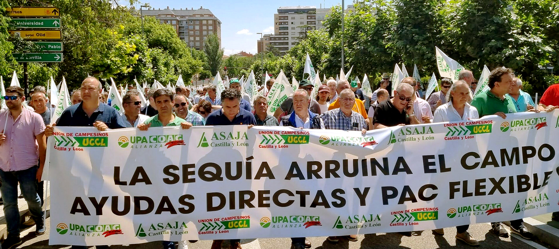 Cerca de tres mil agricultores y ganaderos, procedentes de Palencia y de las otras ocho provincias de Castilla y León, se han manifestado este 15 de junio en las calles de Valladolid, respondiendo a la convocatoria en unidad de acción de las organizaciones profesionales agrarias ASAJA, Alianza UPA-COAG y Unión de Campesinos UCCL. Los convocantes denuncian la «catastrófica» situación a la que se enfrenta el sector agropecuario en la comunidad y reclaman más apoyo de las administraciones públicas, con el que paliar unas pérdidas que superarán los dos mil millones de euros, a causa de la peor sequía de los últimos años, en un contexto de problemas añadidos, como los altos costes de producción y la bajada del precio del cereal, entre otras circunstancias, que ponen en riesgo la continuidad de miles de explotaciones.