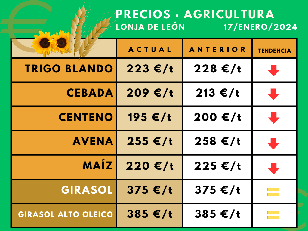 La última sesión de la Lonja de León ha deparado este miércoles un sensible descenso en todos los cereales, cuyas cotizaciones han perdido por tonelada entre tres y cinco euros. Según la entidad leonesa, la depreciación se debe a las mejores estimaciones de cosecha mundial de maíz, pero también a que siguen presionando a la baja las importaciones de grano que reciben los puertos de España, reiteradamente denunciadas por ASAJA, ya que a estos precios se está minando la rentabilidad del cultivo nacional. Por su parte, la cotización del girasol permaneció estable y la de la patata ratifica su tendencia alcista ante el temor de una menor oferta.