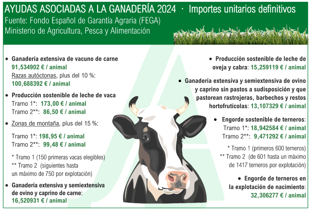 Los importes unitarios definitivos se establecen tomando como base el número de animales con derecho a pago en cada una de las líneas de ayuda, una información que facilitan las comunidades autónomas, y se modulan según las diversas líneas en función de factores como el número de cabezas por explotación, la insularidad, la ubicación en montaña y las razas autóctonas.