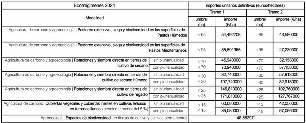 El Fondo Español de Garantía Agraria (FEGA) ha publicado ya los importes unitarios definitivos de los ecorregímenes de la campaña 2024, con los que se podrán liquidar la totalidad de los pagos a los solicitantes de estas ayudas antes del 30 de junio. Los ecorregímenes, con prácticas voluntarias que van más allá de la línea básica (condicionalidad reforzada), son una de las novedades de la vigente PAC 2023-2027. Los ecorregímenes incluyen las diversas prácticas de la agricultura de carbono y agroecología. Con respecto a los importes definitivos de la campaña anterior de 2023, hay ciertas diferencias en los montantes, que en algunos casos llegan a doce euros más por hectárea.