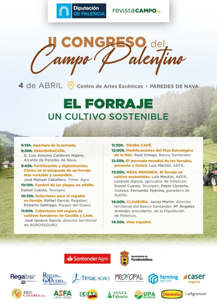 Los avances técnicos para la mayor rentabilidad de los forrajes, el control de plagas en la alfalfa, las soluciones de regadío para los forrajes, las coberturas de seguro en los cultivos forrajeros en Castilla y León, las últimas modificaciones del plan estratégico de la PAC, el actual mercado mundial de los forrajes y sus perspectivas protagonizarán las intervenciones, mientras la sostenibilidad de este tipo de cultivos se abordará en una mesa redonda en la que participarán, entre otros, el vicepresidente de ASAJA-Palencia, Lorenzo García Valenceja, agricultor con explotación en Villalcón.