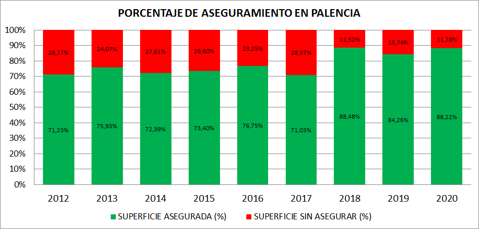 La superficie asegurada ha sufrido un salto cualitativo tras la sequía que arrasó Palencia en 2017 mostrando la cara amarga de la agricultura y recordando la necesidad de contar con el seguro agrario año tras año como un gasto más de la explotación. En la pasada cosecha se alcanzó un grado de aseguramiento del 88,22%, lo que denota la importancia del seguro agrario.