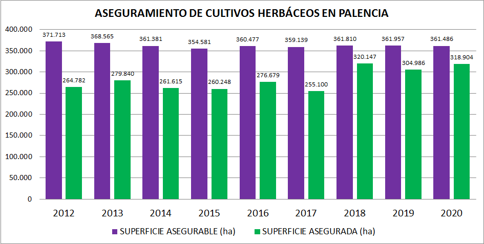 Por las propias características agronómicas de la provincia de Palencia, la línea del seguro agrario más implantada es la que cubre los riesgos acaecidos en las explotaciones destinadas a cultivos herbáceos extensivos. En esta línea de seguro se incluyen las producciones de todo aquello que tenga como destino la producción de grano, ya sean cereales, leguminosas u oleaginosas.