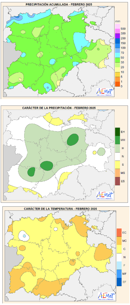 Así se aprecia en el mapa central, donde aparece en color verde claro la zona donde las precipitaciones fueron algo más húmedo de lo normal (H) , en blanco la franja donde resultaron normales (N) y en amarillo donde hubo algo menos de lluvia y nieve de la que cabe esperar en febrero (S), la parte más al norte; tomando como referencia los valores del periodo 1991-2020.