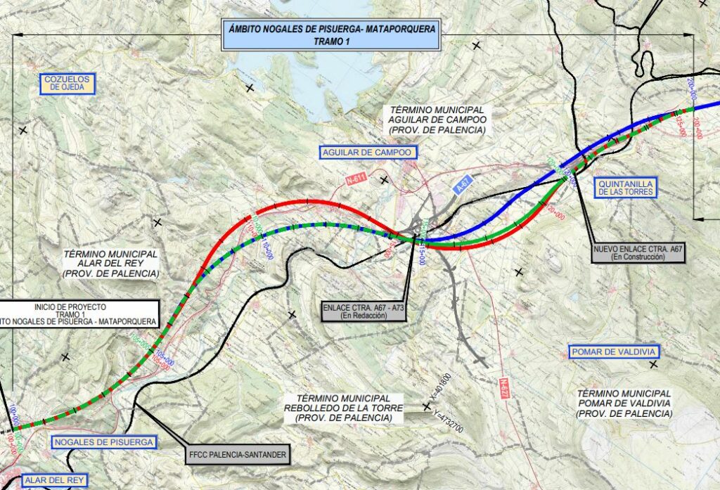 Con todo esto, está en trámite un estudio informativo para el tramo Nogales de Pisuerga – Reinosa (Cantabria), el cual puede acabar con una pequeña Comunidad de Regantes existente en la localidad de Lomilla. Esta Comunidad cuenta con unas 300 hectáreas de regadío que riegan por gravedad con agua acumulada en una presa que se llena mediante bombeo y es una de las primeras comunidades de regantes modernizadas en Palencia. El estudio plantea en la zona de Lomilla dos variantes, la este (color rojo) y la oeste (azul). Llevará la línea del AVE por la línea este eliminará unas 55 hectáreas de esta comunidad de regantes, lo que será un gran daño para los expropiados y para los comuneros que queden, ya que los gastos fijos tendrán que pagarlos entre menos hectáreas. Eliminar más del 18% de una Comunidad de Regantes no es una opción y el tren debe buscar otra opción.