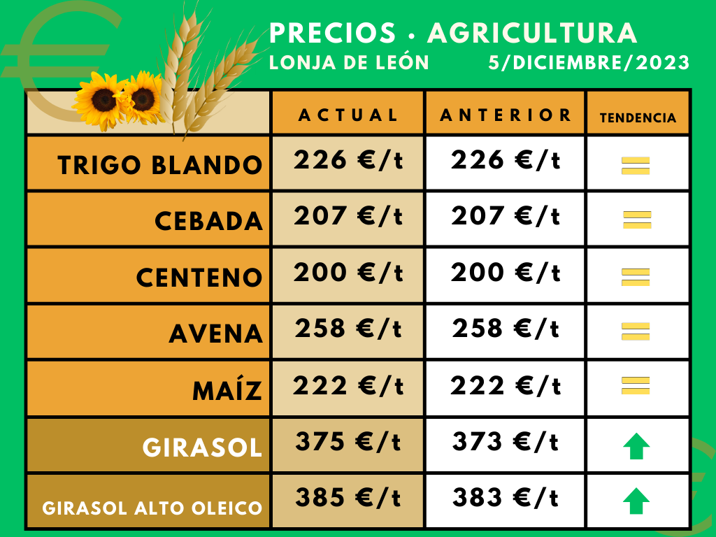 En esta semana de festivos, la Lonja de León adelantó al martes 5 de diciembre su sesión semanal, en la que han repetido precios todos los cereales, a la espera de la tendencia que marquen los mercados internacionales. Como destacan desde el organismo leonés, «la rentabilidad a los precios actuales para los agricultores está ya en entredicho, con bajadas desde máximos del año pasado que se acercan en algunos casos al 40%». Es el caso del trigo, que en el mercado de Santa María del Páramo llegó a alcanzar los 370 euros por tonelada y ahora cotiza a 226 euros/tonelada.
