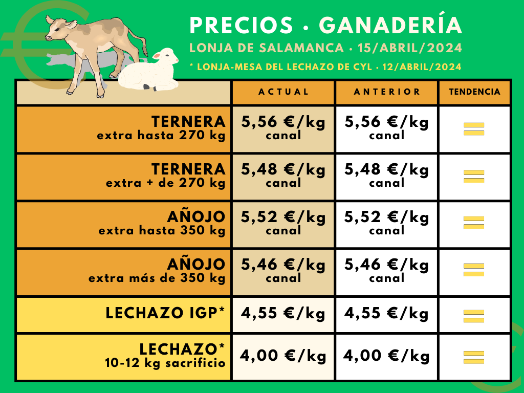 En la mesa del vacuno para sacrificio de la lonja de Salamanca celebrada este lunes, 15 de abril, ha habido acuerdo para repetir todos los precios de terneras y añojos. Los ganaderos han insistido en que los precios de los machos grandes siguen bajos, mientras los compradores piensan que sucede otro tanto con las terneras, que a su juicio se hallan altas en las tablillas de cotización.