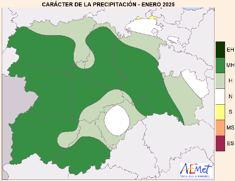Según se refleja en el mapa adjunto de la AEMET, casi toda la provincia registró bastantes más precipitaciones de las normales para un mes de enero. Prácticamente toda Palencia el mes puede considerarse muy húmedo (MH, color verde medio), como en la mayor parte de Castilla y León (toda Zamora y la mayoría de las comarcas de Ávila, Burgos, León y Salamanca; y el tercio suroeste de Soria).