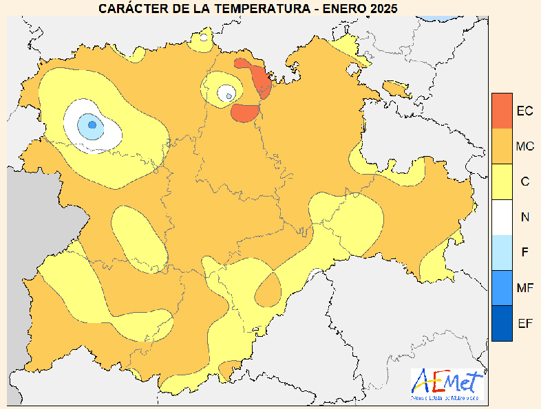 En su balance, la delegación territorial de la AEMET destaca que ha sido un enero muy cálido (MC) en gran parte de Castilla y León. Así ha sido en casi toda la provincia de Palencia, como se aprecia en el mapa adjunto (color naranja), si bien hay zonas puntuales donde ha llegadio a ser extremadamente cálido (EC, color rojo), y en el territorio entre Saldaña y Guardo, al noroeste de la provincia, se ha comportao de manera normal (N, blanco) o con temperaturas algo más cálidas para enero (C, amarillo).
