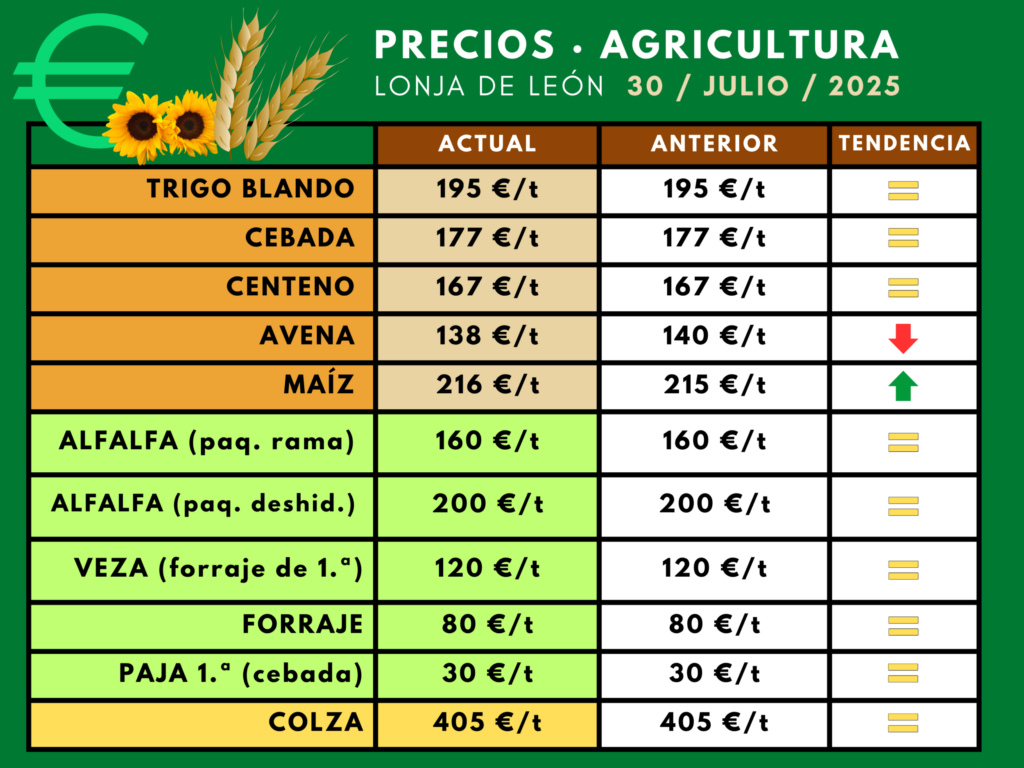 La Lonja de León no ha acusado este miércoles reacción significativa al reciente acuerdo arancelario entre la Unión Europea y Estados Unidos. Pero hay un clima de tensa expectativa ante la letra pequeña del pacto, con posibles repercusiones sobre los productos agroalimentarios españoles. Desde el mercado leonés apuntan que otros factores internacionales (precio del petróleo, paridad del euro con el dólar, nivel de cosecha ceralista mundial, etcétera) también flotan en el ambiente. Su evolución marcará en gran medida los precios del grano español, que en todo caso siguen a precios bajísimos para los actuales costes productivos. La avena sí se movió, pero a peor: se dejó dos euros por tonelada, partiendo ya de niveles subterráneos. ASAJA-Palencia te explica aquí, con datos elocuentes, por qué la importación masiva de avena en el último trienio también ha ido minando el precio de este cereal.