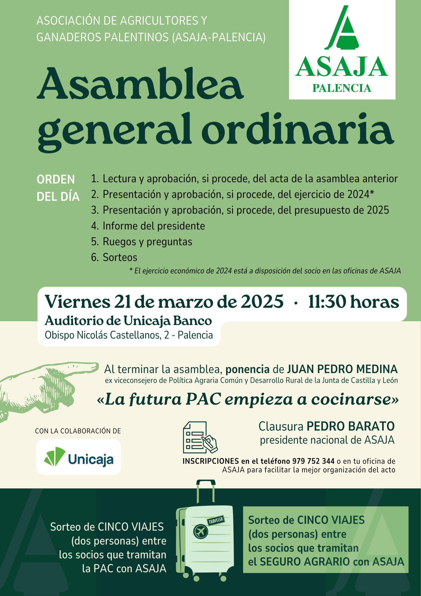 Por todos estos alicientes añadidos, así como por el interés propio de cada asamblea ordinaria anual, incluido el informe del presidente José Luis Marcos, ASAJA-Palencia anima a los asociados a asistir. Cara a una mejor organización del evento, rogamos la inscripción en tu oficina de ASAJA, o en el teléfono 979 752 344.