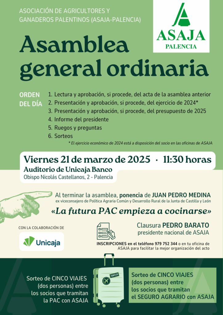ASAJA-Palencia celebra este viernes 21 de marzo (11:30 horas) su asamblea general ordinaria en el auditorio de Unicaja (Obispo Nicolás Castellanos, 2) de la capital. Aparte del orden del día y tras los sorteos de viajes, Pedro Medina, exviceconsejero de PAC y Desarrollo Rural de la Junta de Castilla y León, ofrecerá una interesante conferencia sobre el futuro de la política agraria de la UE. Nuestro presidente nacional, Pedro Barato, pronunciará posteriormente el discurso de clausura del acto.