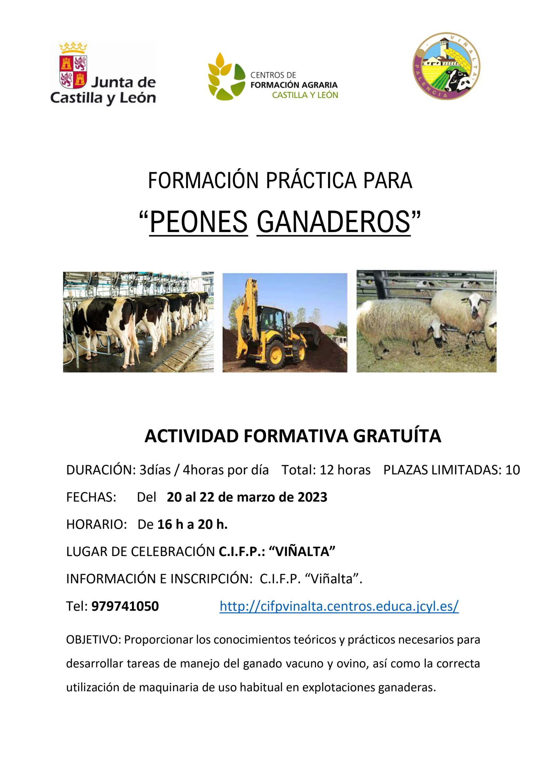 El Centro Integrado de Formación Profesional “Viñalta”, situado en el barrio de Allende el Río de la ciudad de Palencia, ofrece una actividad formativa gratuita, de doce horas de duración, titulada «Formación práctica para peones ganaderos», que se desarrollará del 20 al 22 de marzo, ambos inclusive, en horario de tarde (de 16:00 a20:00 horas).