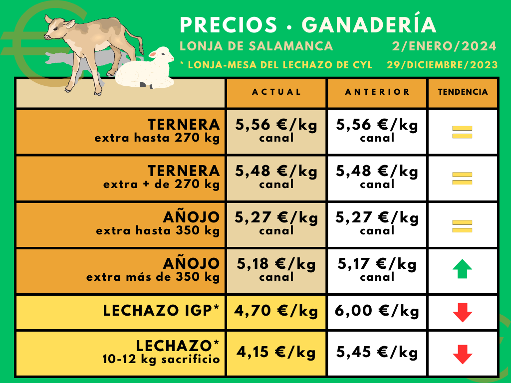 La cotización de lechal para sacrificio (de entre diez y doce kilos) perdió también 1,30 euros en la última sesión de 2023 con respecto a la anterior, al pasar de los 5,45 euros/kilo a 4,15 euros/kilo. Es un precio sensiblemente inferior al de un año antes (4,40 €/kg), lo que representa una caída interanual del 5,7%.