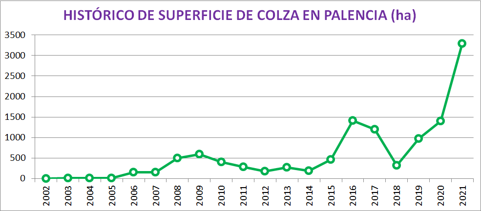 Los datos relativos a la cosecha de este año son muy halagüeños para la colza palentina. Casi todas las provincias de Castilla y León han aumentado la superficie destinada a colza pero es Palencia la que mayor aumento ha tenido, llegando incluso a doblar la superficie sobre la de la campaña pasada. Para la próxima campaña parece existir cierta apetencia por el cultivo en el sector y las previsiones de siembra son también positivas.