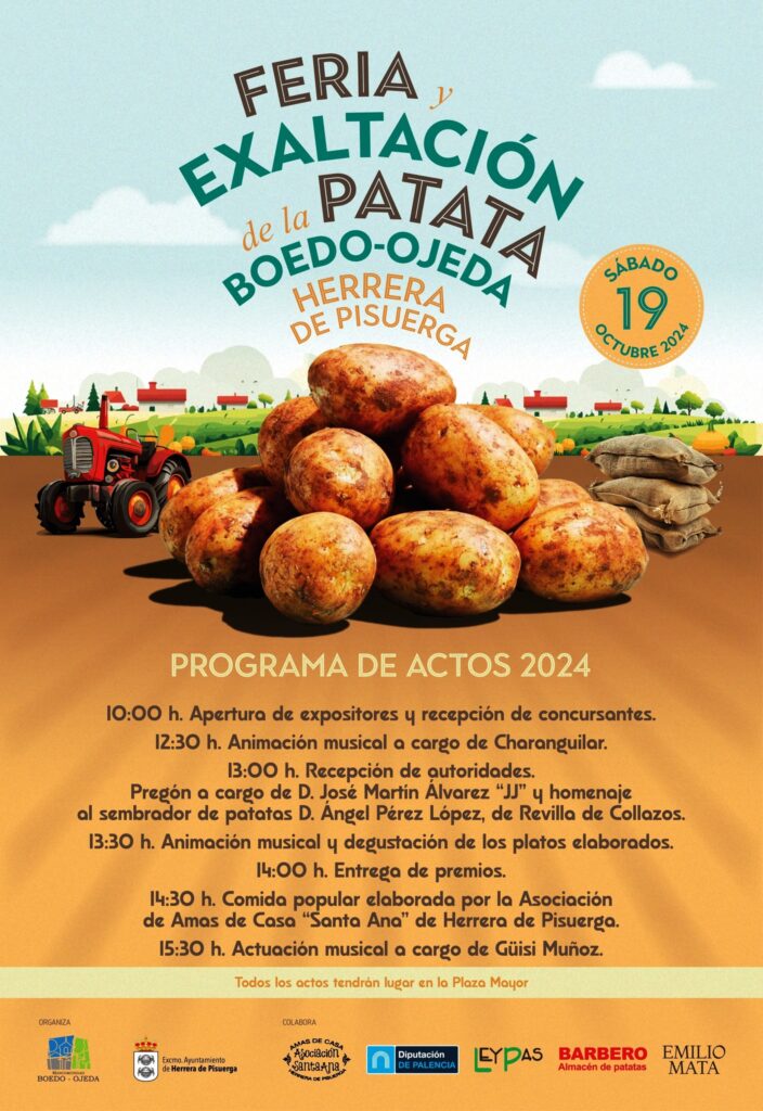 Herrera de Pisuerga acoge este sábado, 19 de octubre, la Feria y Exaltación de la Patata Boedo-Ojeda, organizada por el Ayuntamiento de la localidad y la Mancomunidad Boedo-Ojeda. Desde las diez de la mañana estarán abiertos los expositores de una jornada en la que oficiará como pregonero, a partir de las 13:00 horas, Jesús José (JJ) Martín Álvarez, agricultor socio de ASAJA-Palencia y empresario de la patata a través de la firma familiar Propacer, con más de medio siglo de experiencia en el sector agrario, especializada en patata de siembra certificada, entre otros productos y servicios agrícolas.