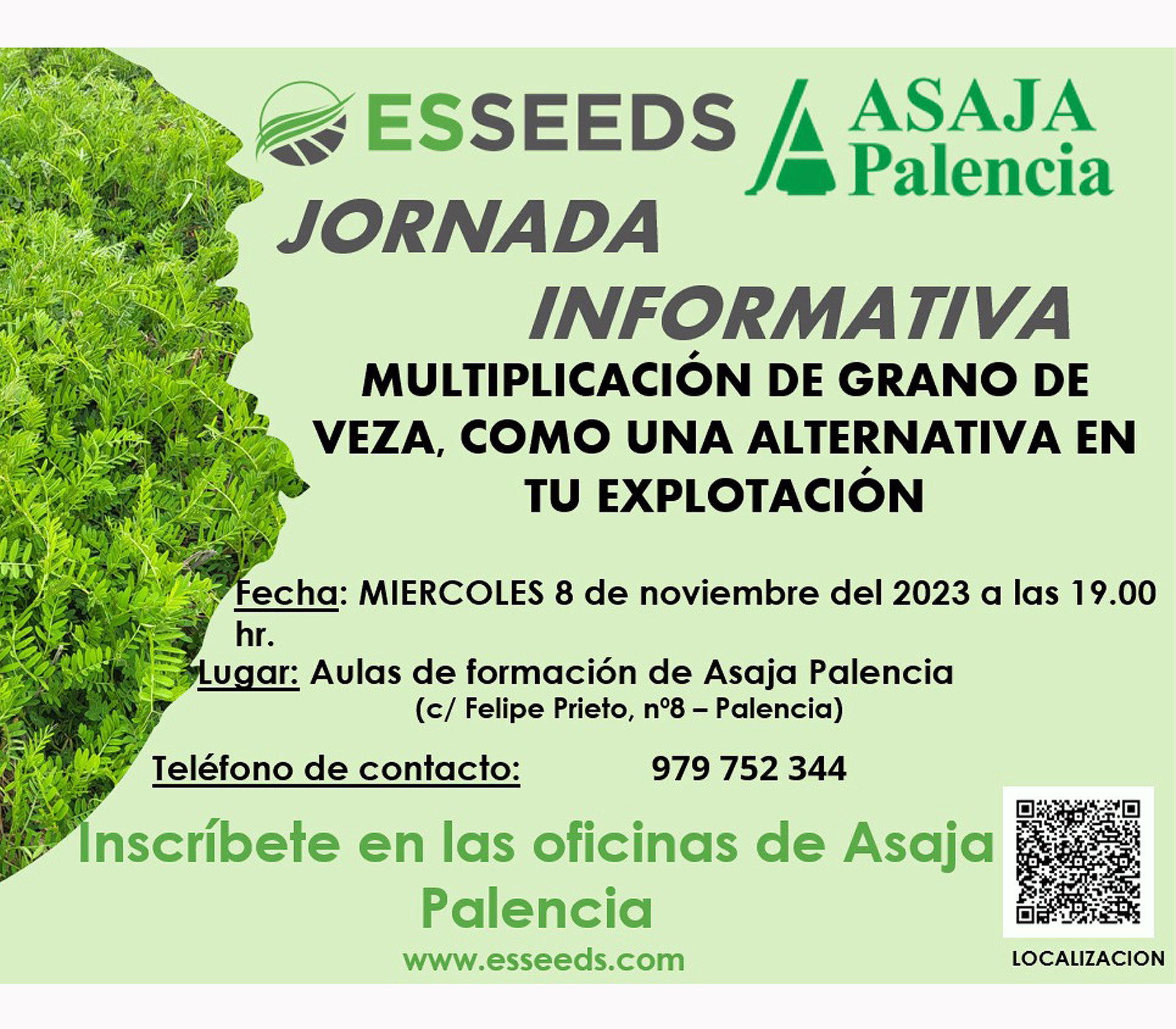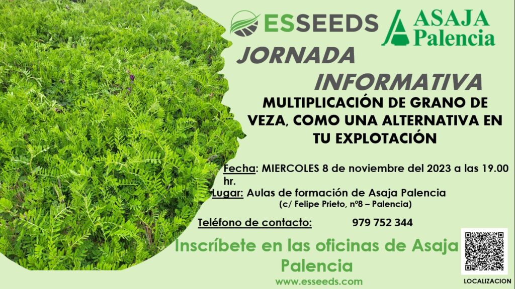 ASAJA-Palencia y la empresa especializada en semillas ESSEEDS (Efecto Soluciones, S.L) han organizado para este MIÉRCOLES, 8 DE NOVIEMBRE una jornada informativa sobre multiplicación de grano de veza como una alternativa de cultivo para nuestras explotaciones. El acto se celebrará a partir de las siete de la tarde en el aula de formación de nuestra asociación (Felipe Prieto, 8 | Plaza Bigar; frente a la planta baja de las oficinas de la organización).