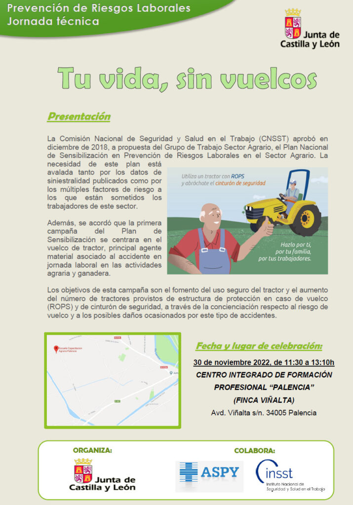 Bajo el lema “Tu vida sin vuelcos”, la Junta de Castilla y León ha organizado una Jornada Técnica de Prevención de Riesgos Laborales en la Agricultura, donde el objetivo es el fomento del uso seguro del tractor, que es el principal agente material asociado a los accidentes que se producen en la jornada laboral de las actividades de agricultura y ganadería.
