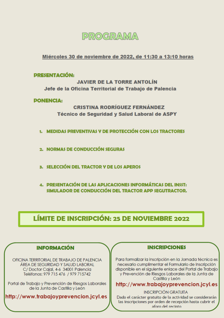La jornada se celebrará el día 30 de noviembre de 11:30 a 13:10 en el Centro Integrado de Formación Profesional Fiinca de Viñalta. La inscripción es gratuita, y es preceptivo cumplimentar un formulario de inscripción en el portal de Trabajo y Prevención de Riesgos Laborales de la Junta de Castilla y León (ENLACE).