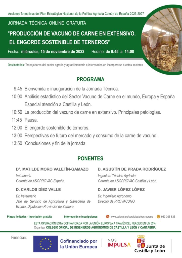 El Colegio Oficial de Ingenieros Agrónomos de Castilla y León y Cantabria ha organizado la jornada técnica ‘Producción de vacuno de carne en extensivo. El engorde sostenible de terneros’, que puede seguirse de manera telemática, con inscripción gratuita y plazas limitadas. Va dirigida a trabajadores del sector agrario y agroalimentario, así como a personas interesadas en incorporarse a esta actividad. Se ofrecerá este miércoles, 15 de noviembre, en horario de mañana (9:45-14:00 horas).