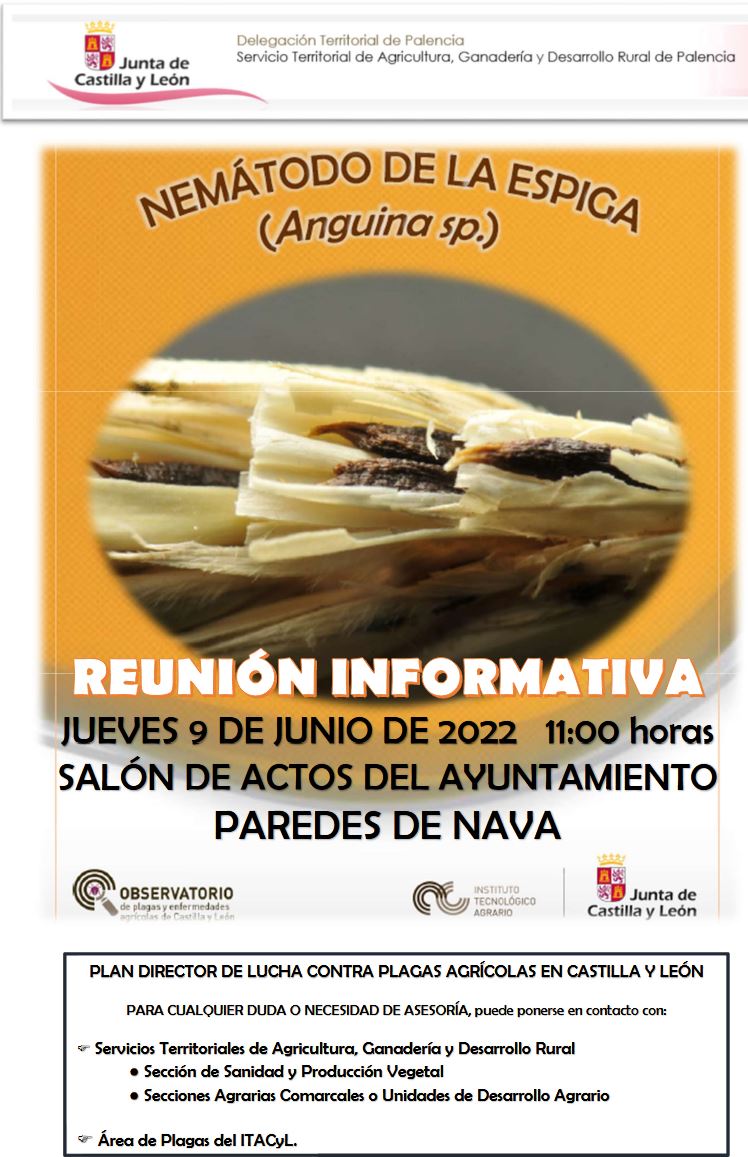 El jueves día 9 de de junio el Observatorio de Plagas y Enfermedades Agrícolas de Castilla y León ha organizado una reunión informativa en el salón de actos del Ayuntamiento de Paredes de Nava en la que se convoca a aquellos agricultores que siembren cebada, o manejen cosechadoras que trabajen en la zona, y donde se hablará de la anguina o nemátodo de la espiga. Aunque en la comunicación del Observatorio de Plagas no se indica, se entiende que se ha detectado la presencia de anguina en estos dos términos municipales de la comarca de Campos.