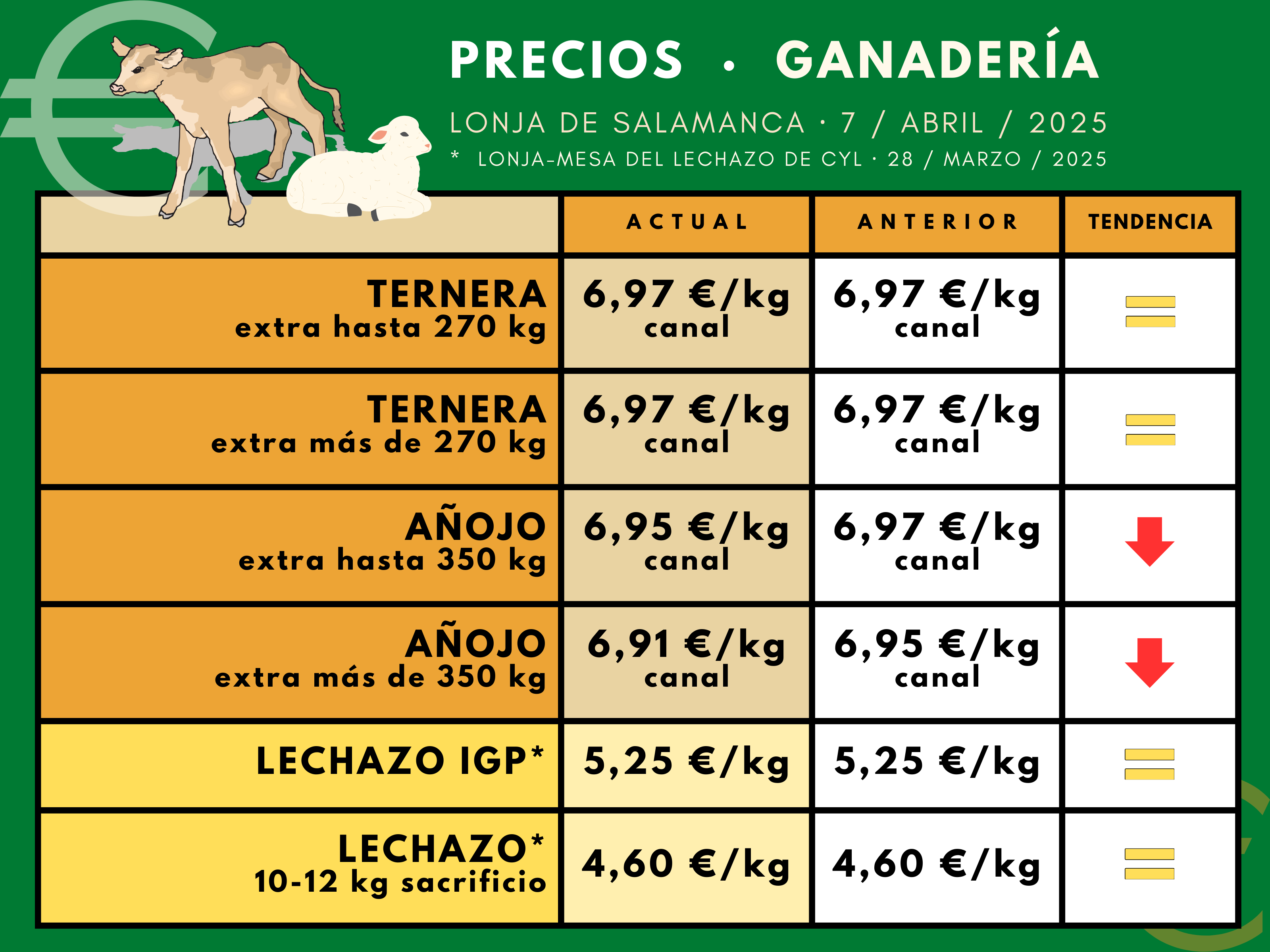 La mesa de bovino de carne de la Lonja de Salamanca se apuntó este lunes, 7 de abril, una nueva bajada para los añojos, extendida esta semana con independencia de las categorías de peso. Si la corrección a la baja sólo afectó la sesión anterior a los de más de 350 kilos, esta vez la cotización de los más grandes ha perdido cuatro céntimos por kilo, y dos céntimos por kilo en los menores de ese umbral. Los ganaderos reconocen que hay una oferta algo superior a la que se estimaba, que aconseja ese retoque para no frenar las operaciones.