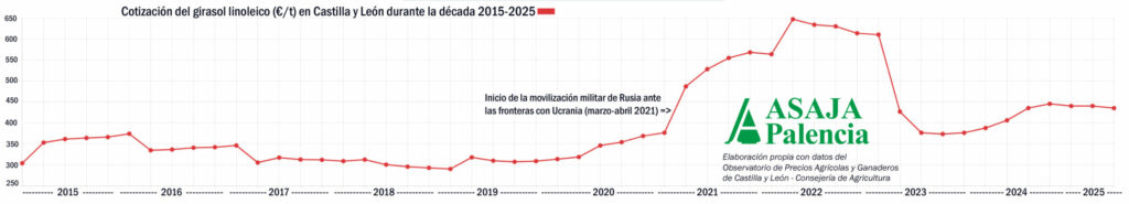 2020-2021, UN CAMBIO DE TENDENCIA. Ciertamente, tampoco hay que perder de vista que los precios actuales del girasol (con independencia de las variedades) han conservado una parte de la burbuja del bienio 2021-2022 que se infló en el prólogo de la guerra de Ucrania, como se aprecia en el gráfico adjunto.