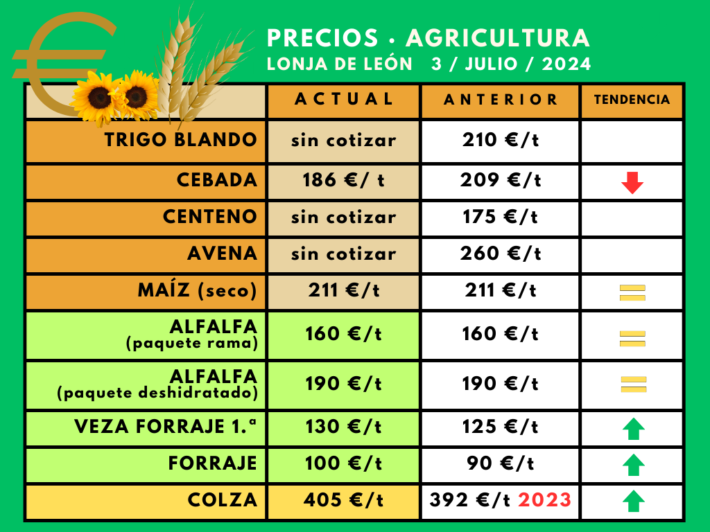 Cara y cruz en los primeros precios de la cebada y la colza en la nueva campaña visados por la Lonja de León este miércoles, 3 de julio. El cereal, en plena campaña de recolección en nuestra provincia, se sitúa a 186 euros/tonelada, con lo que registra una severa caída del 11 % con respecto al último precio de la campaña anterior y vuelve a precios que no se veían desde 2020. Por su parte, la oleaginosa se cotiza a 405 euros/tonelada, ligeramente por encima de los precios con los que la colza abrió (395 €/t) y cerró (392/t) la temporada el verano de 2023 en el mercado leonés.