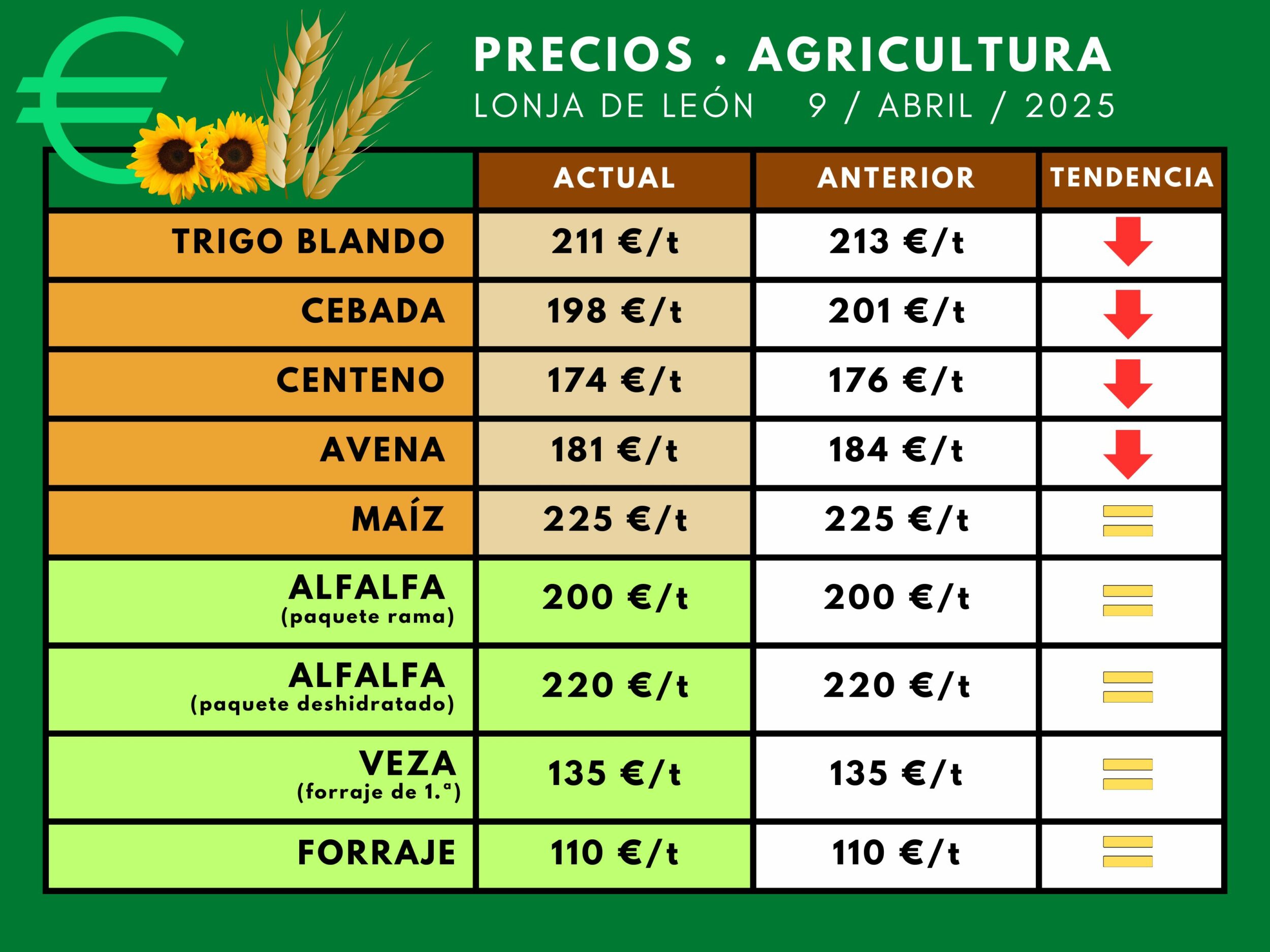La sesión de la Lonja de León celebrada este miércoles, 9 el abril, ha constatado un nuevo recorte en la cotización de los cereales de invierno, cuya demanda se ha paralizado por la incertidumbre generada por la guerra de los aranceles. Salvo el maíz, que repitió precio, todo el grano se resintió en mayor o menor medida, pero la bajada fue más acentuada, con tres euros, en la avena y la cebada, que pierde el psicológico listón de los doscientos euros por tonelada.
