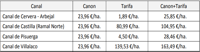 Para el año 2022 el coste para las comunidades de regantes del Pisuerga es el siguiente: