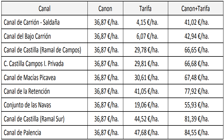 Para el año 2022 el coste de las comunidades de regantes del Carrión es el siguiente: