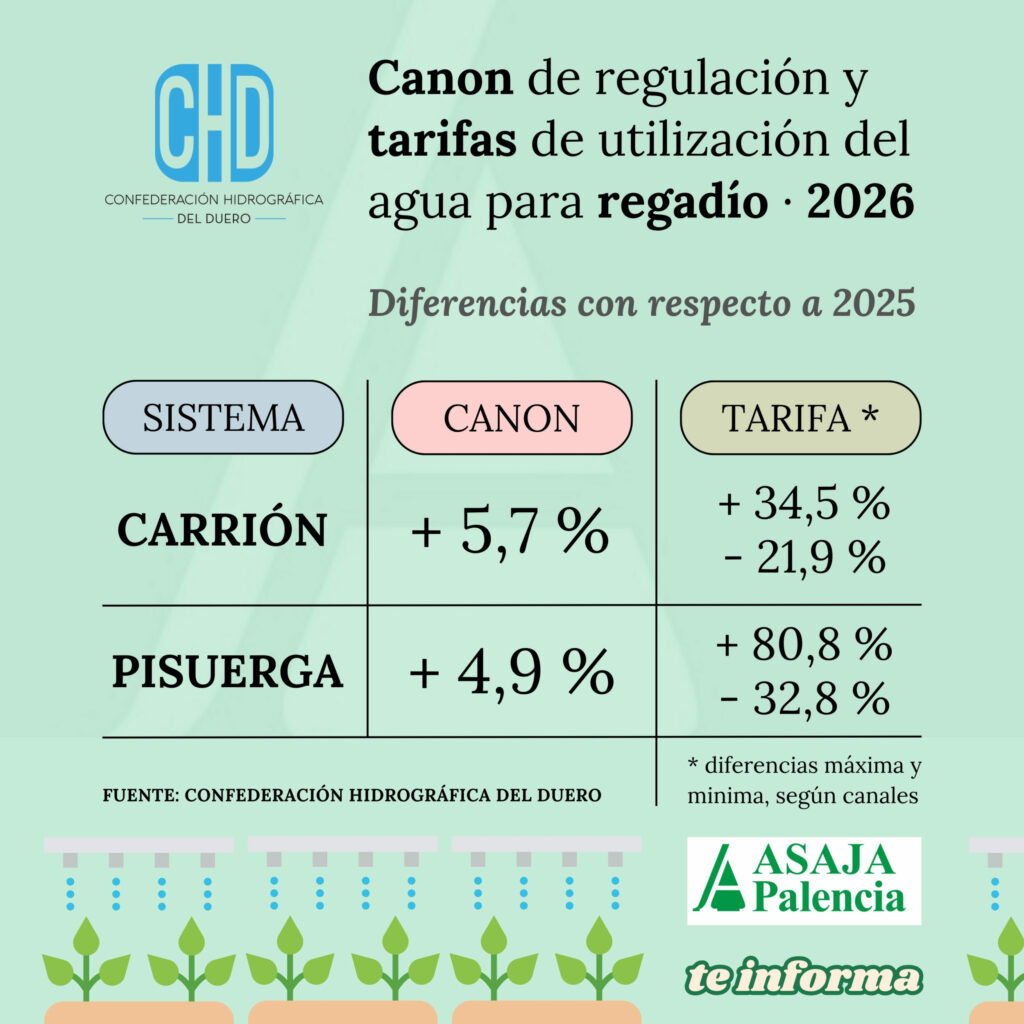 La Confederación Hidrográfica del Duero ha aprobado las tablas con el canon de regulación y las tarifas de utilización del agua correspondiente a las juntas de explotación de los sistemas de la cuenca que regirán en 2026. El canon en la junta de explotación del Carrión será de 41,25 euros por hectárea, mientras en la junta de explotación del Pisuerga será de 33,25 euros por hectárea., lo que representa unas subidas respectivas del 5,7 % y del 4,9 % con respecto a este año. Por su parte, las tarifas de regulación han bajado de promedio el 2,8 % en el sistema Carrión, si bien sube hasta el 34,5%, como el Conjunto de Las Navas; y baja en torno al 20 % en canales como el de Carrión-Saldaña, el Bajo Carrión y La Retención. En el sistema Pisuerga hay un promedio de subida del 6,5%, consecuencia del aumento de más del 80 % en la tarifa del Canal de Cervera-Arbejal, ya que en los otros cuatro de la provincia de Palencia bajan entre el 20 % y el 33 %.