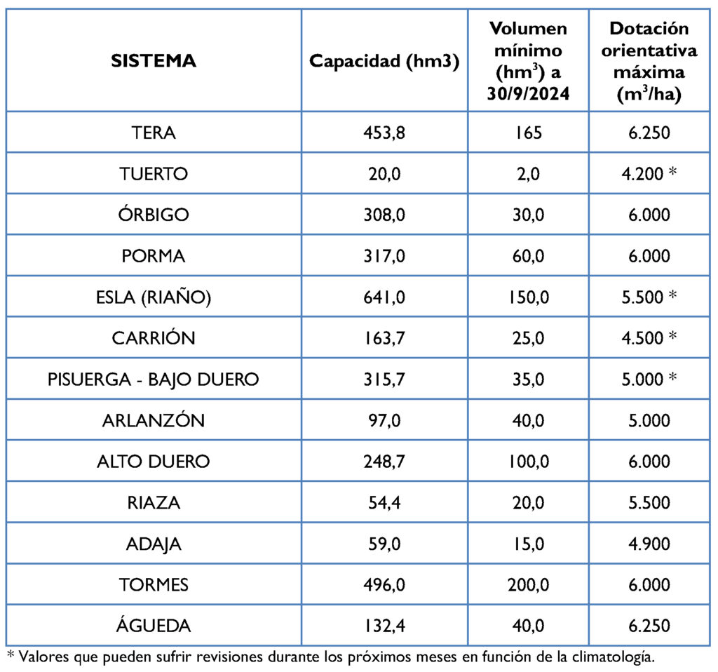 La buena situación hidrológica permitirá, por una parte, asegurar o mejorar las dotaciones máximas que estimadas en marzo en varias juntas de explotación (Órbigo, Riaza o Pisuerga-Bajo Duero), así como ampliar los objetivos de volumen mínimo de embalse en determinados casos, como Riaño, Porma o Castro de las Cogotas.