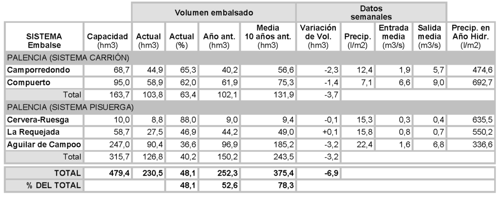 La sequía de los últimos meses no ha hecho sino acentuar la gravísima situación de partida en los embalses del Pisuerga, en especial el de Aguilar de Campoo, cuya capacidad (247 hectómetros cúbicos) representa el 78% del total del sistema que ronda los 480 hectómetros cúbicos. A fecha de hoy, 31 de mayo, sus tres embalses se hallan muy cerca de perder el umbral del 40% y —lo que preocupa más a los regantes si la meteorología no cambia—, ya con menos de 127 hectómetros cúbicos, sensiblemente por debajo del volumen embalsado el pasado año por estas mismas fechas (150,2 hm3).