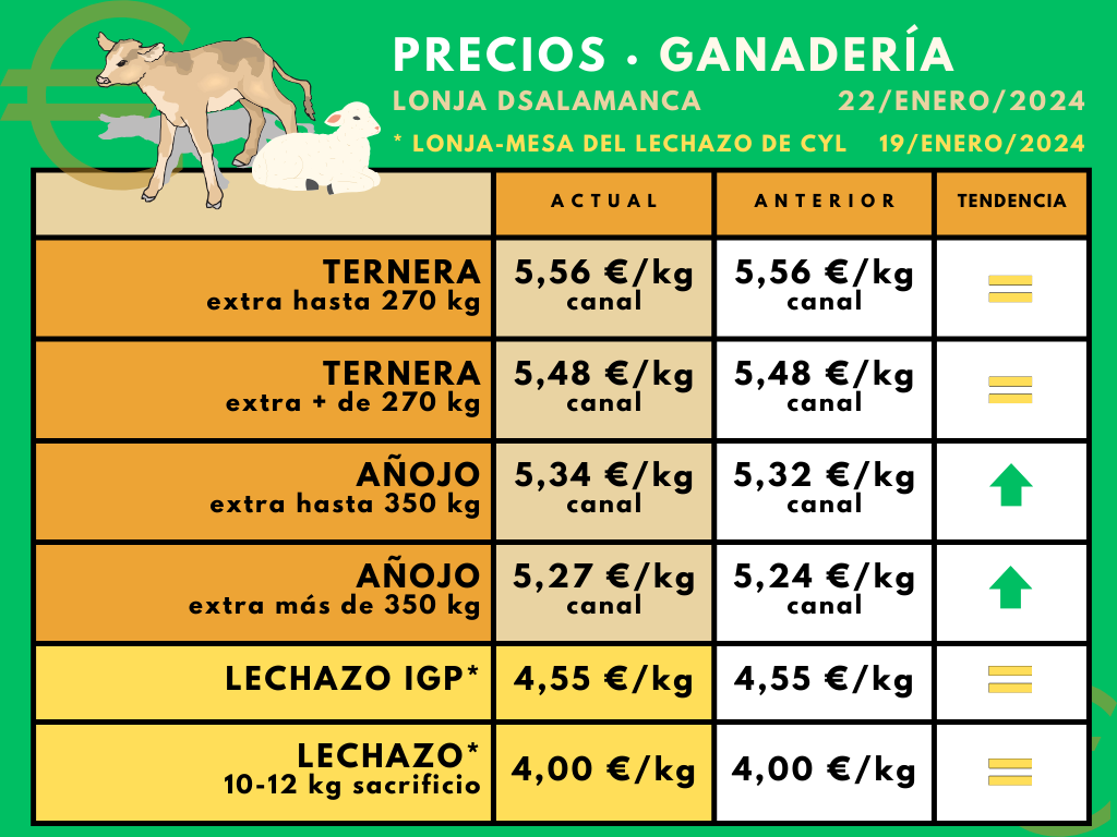 La cotización del lechazo frena su lógica caída tras la época navideña, a tenor de los datos de la lonja de la Mesa del Lechazo de Castilla y León del viernes 19 de enero, ya que todas las categorías repitieron con respecto a los precios fijados quince días antes. Por su parte, en la Lonja de Salamanca celebrada este lunes 22, se confirmaron las tendencias de las últimas semanas: mientras las categorías de ternera repitieron cotizaciones, la de los añojos sigue su paulatina recuperación debido a la menor oferta, pero sigue en torno al 2,5% más baja que hace justo un año.
