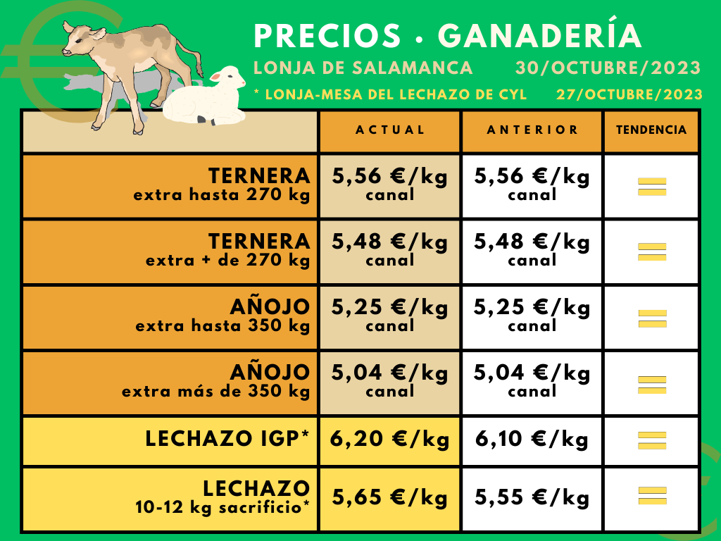 Por lo que respecta al vacuno de carne, la cotización marcada este lunes, 30 de octubre, en la Lonja de Salamanca repite por quinta semana consecutiva en prácticamente todas las categorías.