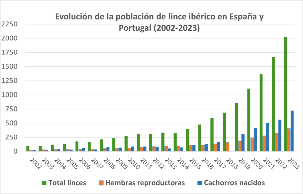 Después de superarse el millar de ejemplares en el censo elaborado en 2020, en tan solo tres años se ha logrado duplicar esa población ibérica, que suma a casi mil trescientos linces adultos o subadultos y los 722 cachorros nacidos en 2023.