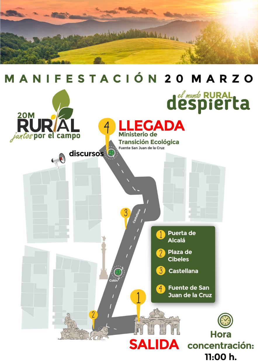 A la espera de la confirmación definitiva del recorrido por parte de la Delegación del Gobierno, esta movilización tiene previsto partir desde la Puerta de Alcalá a las 11 de la mañana para continuar por el Paseo de la Castellana y finalizar en la fuente de San Juan de la Cruz, a la altura del Ministerio para la Transición Ecológica y Reto Demográfico (MITECO), donde se llevará a cabo la lectura del manifiesto que recoge las reivindicaciones de todos los convocantes: Cooperativas Agro-alimentarias de España, Federación Nacional de Comunidades de Regantes de España (FENACORE), ASAJA, COAG, UPA, Oficina Nacional de la Caza (ONC), Real Federación Española de Caza (RFEC), Unión de Criadores de Toros de Lidia (UCTL), Alianza Rural y todas las entidades que las conforman; que se movilizarán bajo el lema “Juntos por el Campo”.