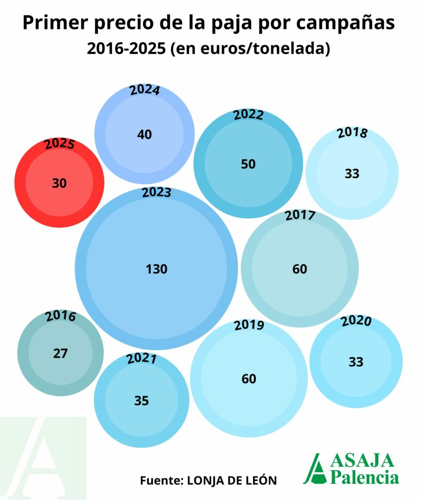 Con esos datos, el promedio del primer precio de la tonelada de paja en la Lonja de León durante la última década se situaría en torno a los cincuenta euros (la cantidad que valía al inicio de la campaña de 2022); pero no perdamos de vista que uno de los años (2023) empezó a un nivel ya altísimo, debido a la fuerte sequía de los meses de abril y mayo, que anticiparon la cosecha desastrosa del cereal.