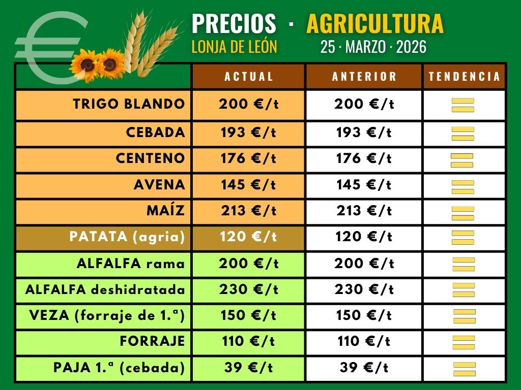 En cereales, el precio del trigo blando repite a 200 €/t, la cebada a 193 €/t, el centeno a 176 €/t y el maíz seco a 213 €/t y la avena a 145 €/t.