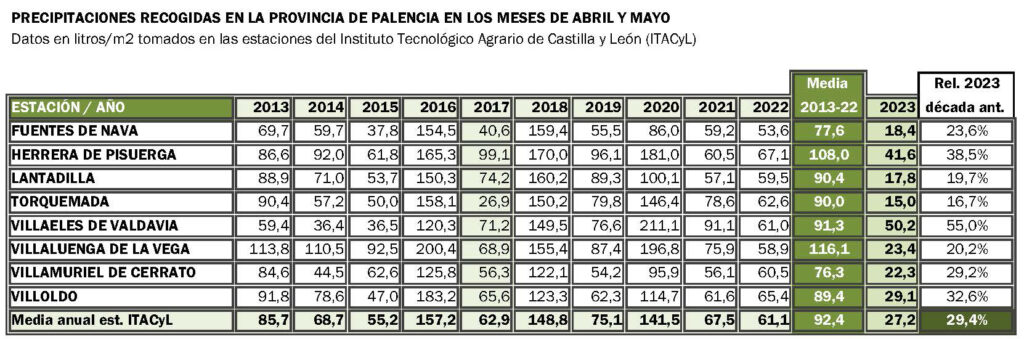 Solo en una de las estaciones del ITACyL, Villaeles de Valdavia, se superaron los cincuenta litros por metro cuadrado —en concreto, 50,2 l/m2—, pero esa cifra apenas supera la mitad (55%) de la cantidad media registrada en ese mismo punto en los meses de abril y mayo de la década inmediatamente anterior (91,3 l/m2). El caso de Villoldo, con solo 29,1 litros por metro cuadrado y menos de un tercio del precedente de la década pasada (32,6%) resulta paradigmático de ese pésimo comportamiento pluviométrico en la provincia de Palencia y, en su caso, del que ha padecido esta primavera Tierra de Campos./