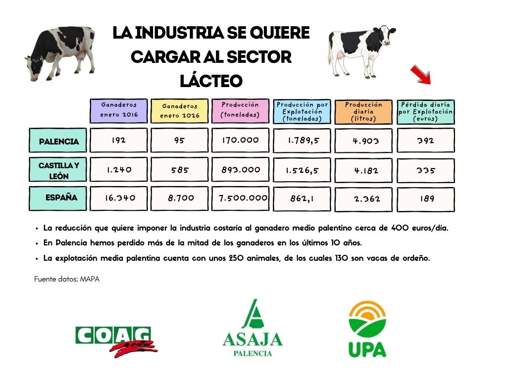 Ha informado Donis que en estos dos próximos meses vence el 90% de los contratos lecheros con los ganaderos y que, mientras los ganaderos quieren negociar, las industrias, «que parece que se están poniendo de acuerdo», quieren imponer precios a la baja de 7-8 céntimos/litro. Según el responsable de UPA Palencia, eso supondría una «pérdida diaria de casi 400 euros para un ganadero medio de Palencia, que hay que multiplicar por los 365 días del año». La rebaja propuesta por la industria láctea de bajar un 15% el precio de la leche supondría «la ruina del sector» en el peor momento, con subidas en todos los insumos por la guerra en Irán, concluyó.