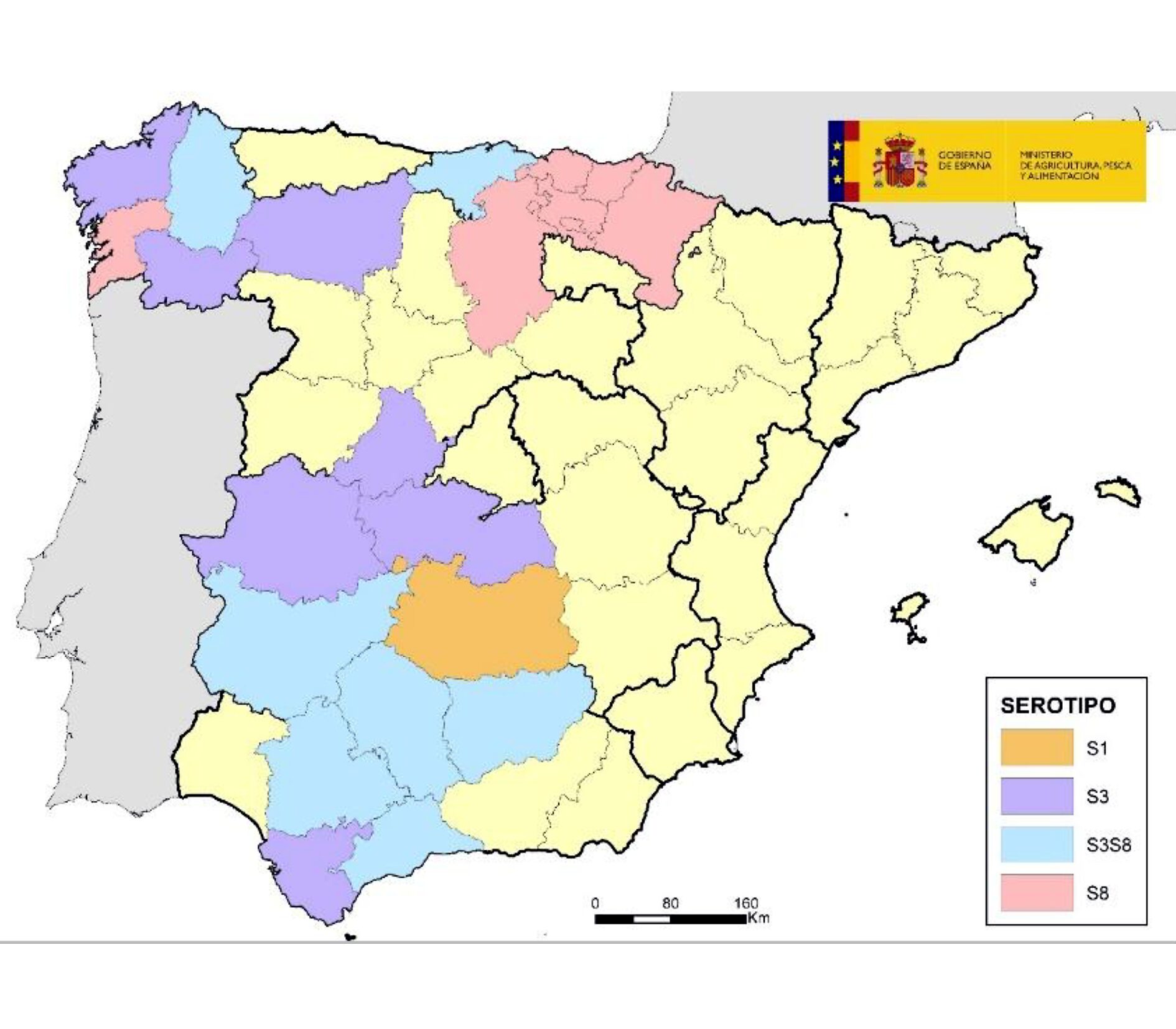Ciudad Real es la única provincia de España con serotipo 1, según se aprecia en el mapa adjunto; mientras los serotipos 3 y 8 parecen circular en una proporción similar dentro de la zona peninsular afectada (fundamentalmente, en los dos tercios oeste).