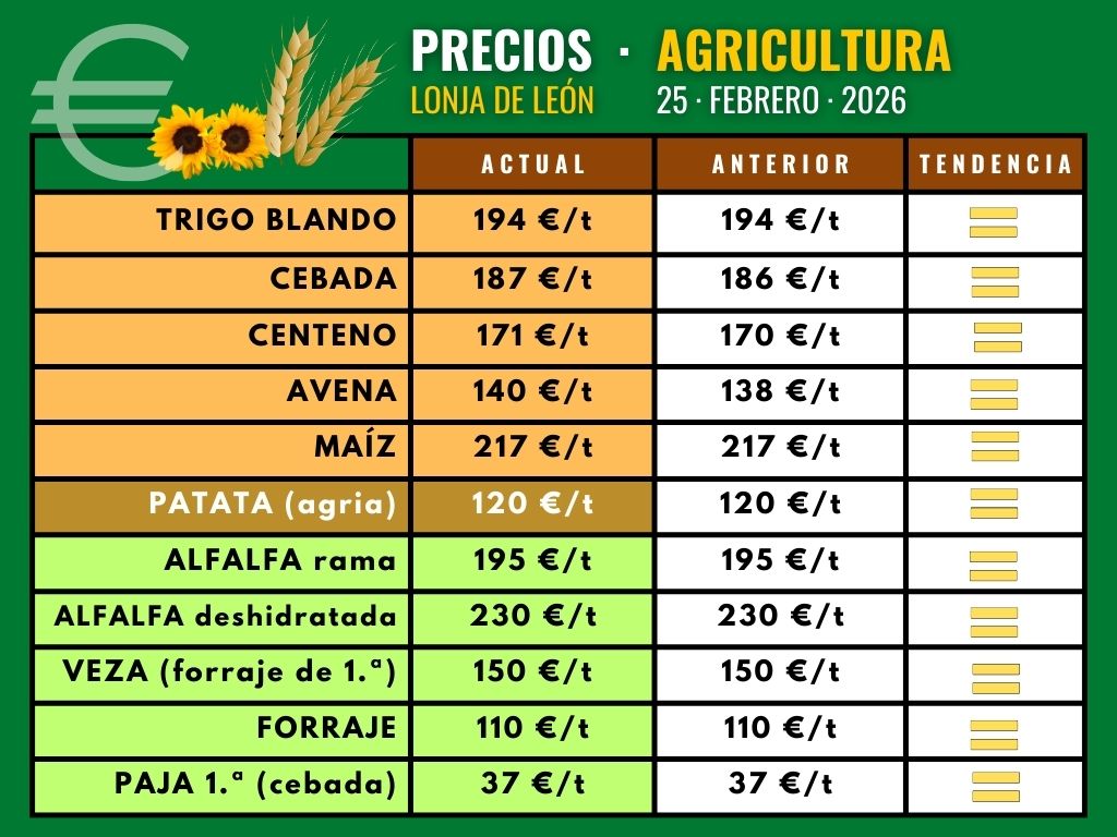 Por su parte, los forrajes mantienen los precios de hace siete días, porque en la sesión de esta semana no han cotizado.