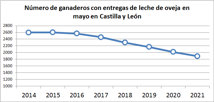 Según los datos del Ministerio, obtenidos de los informes mensuales de declaraciones de leche de oveja, el número de ganaderos de ovino de Castilla y León, que realiza entregas de leche, no hace más que disminuir notoriamente. Desde 2014 los ganaderos de ovino de leche se han reducido un 27,2%, ahora sólo quedan 1891 repartidos en las nueve provincias de Castilla y León. Esta pérdida de ganaderos es paulatina y en los últimos cinco años la media de reducción anual de ganaderos supera el 5%.