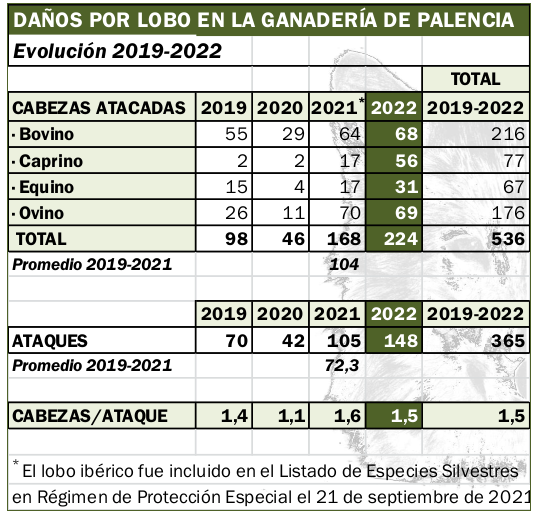 Los efectos de la prohibición total de la caza del lobo al norte del Duero, aprobada en septiembre de 2021, ya se dejan notar en los daños a la cabaña ganadera de la provincia de Palencia. Se cumple el vaticinio que ASAJA-Palencia ya emitió al conocer la decisión del Ministerio para la Transición Ecológica y el Reto Demográfico (MITECO), que auguraba un sensible aumento en los ataques y los consecuentes perjuicios para la ganadería extensiva palentina. Los datos de 2022, primer año completo de vigencia de la nueva norma, son elocuentes. Prácticamente se duplica la cifra de ataques (+105%) con respecto al trienio anterior y el volumen de cabezas dañadas aumenta el 115% en relación con ese precedente inmediato. Los ganaderos de esta provincia han pasado de seis ataques mensuales a superarse los doce al mes en 2022. El pasado año los lobos causaron daño en un promedio de 4,3 cabezas cada semana, cuando eran dos cabezas antes de prohibirse la caza de esta «especie silvestre en régimen de protección especial», según la normativa que aprobó el Gobierno de España el 21 de septiembre de 2021 y cuyos efectos empezaron a notarse rápidamente desde ese mismo otoño. Y hablamos solo de los casos oficiales; es decir, los que denuncia el ganadero, se certifica y tramita la administración. Otra parte de los ataques y del daño —como los perjuicios indirectos— a menudo son de difícil demostración y quedan fuera de esta contabilidad.